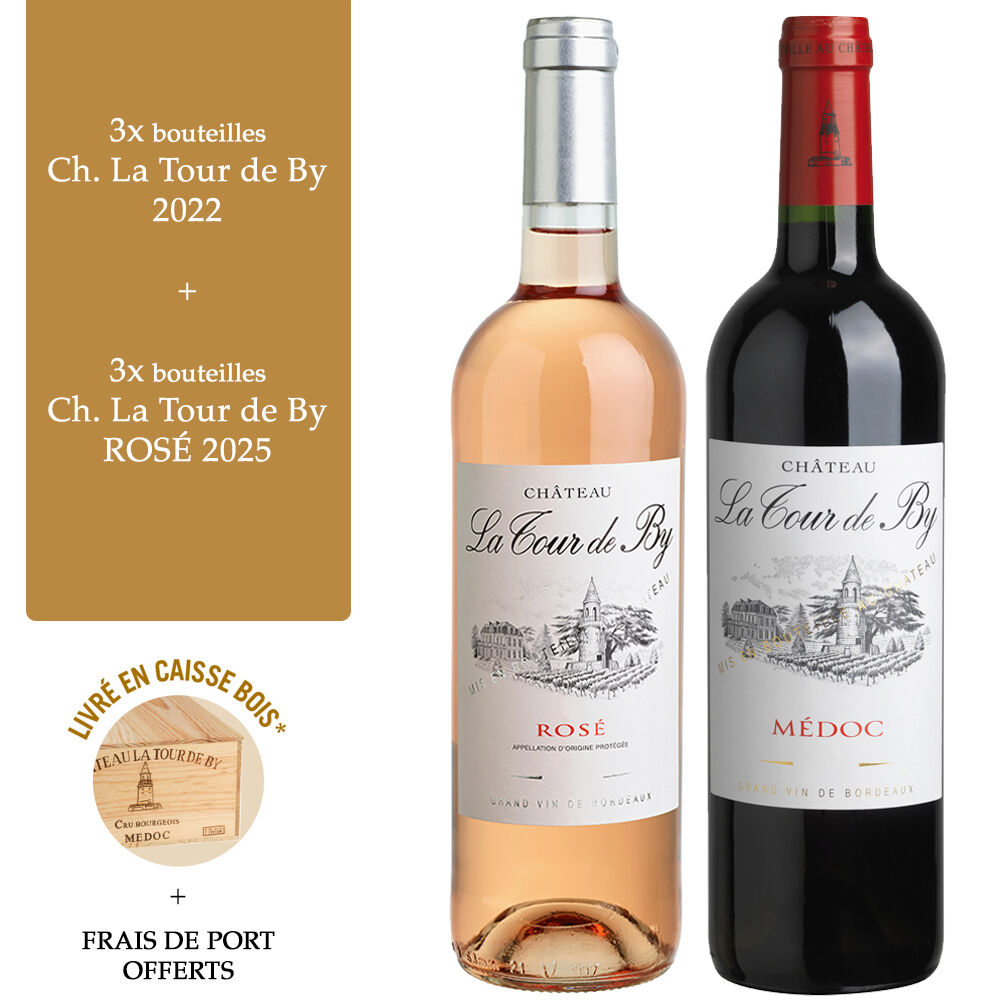 Cette Caisse bois de 6 bouteilles contient : 3 bouteilles, Château La Tour de By 2022 + 3 bouteilles - Rosé - Château La Tour de By 2025.