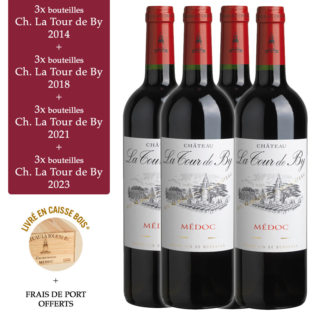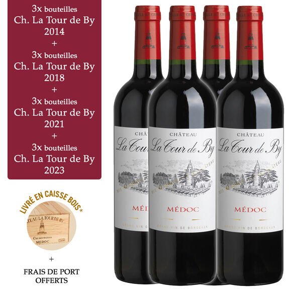 Cette Caisse bois de 12 bouteilles contient : 3 bouteilles - Château La Tour de By 2014 + 3 bouteilles - Château La Tour de By 2018 + 3 bouteilles - Château La Tour de By 2021 + 3 bouteilles - Château La Tour de By 2023.